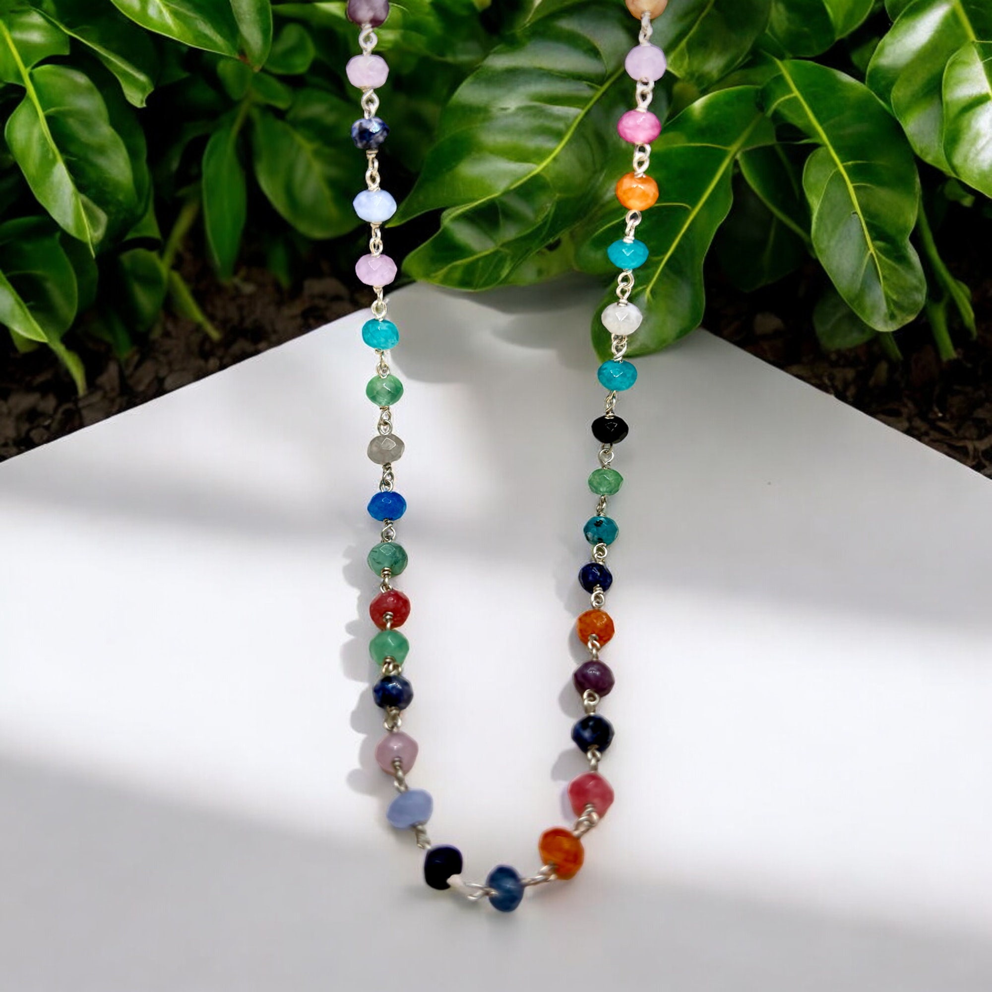 Each handcrafted rosary necklace is made with high-quality sterling silver chain and decorated with multicolor gemstone jewelry, highlighting the beauty of 4mm bead necklace designs. The sterling silver rosary chain offers durability and shine, while the natural bead necklace aspect adds a touch of nature’s beauty. Wear this silver rosary chain necklace to elevate any outfit, whether casual or formal.